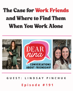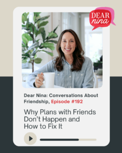 DEAR NINA: Conversations About Friendship is a podcast and newsletter about the ups and downs of adult friendship. I’m the host, Nina Badzin, a Minneapolis-based writer who accepted a position as a friendship advice columnist in 2014 and never stopped. DEAR NINA, the podcast, started in 2021, and has been referenced in The Wall Street JournalThe Washington PostTime Magazine, The GuardianThe Chicago TribuneThe Minneapolis Star Tribune, and elsewhere